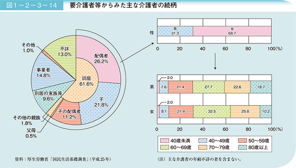 要介護者等からみた主な介護者の続柄は、内閣府の調べによると6割以上が同居している家族でした。その中で、配偶者が26.2%、子が21.8%、子の配偶者が11.2%となっています。同図の右下の介護者の年齢層をみると、男女ともに60歳以上の介護者が全体の半数を超えていることがわかります。これは、昨今の高齢化が要因で、子の世代も高齢化しており、老老介護はけっして珍しい状態ではない時代になったのです。