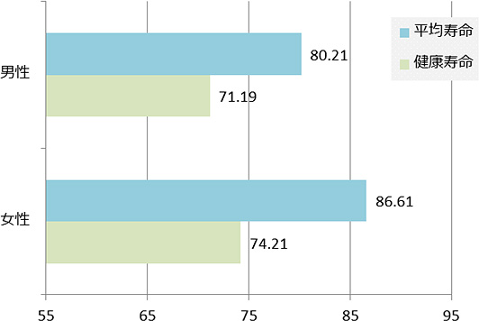 健康寿命に関する最新の情報は、2013年度の調査結果が出ています。男性は71.19歳、女性は74.21歳、となっています。健康面で日常生活に影響が出るようになってから平均寿命まで男性は9年、女性では12年もあります。