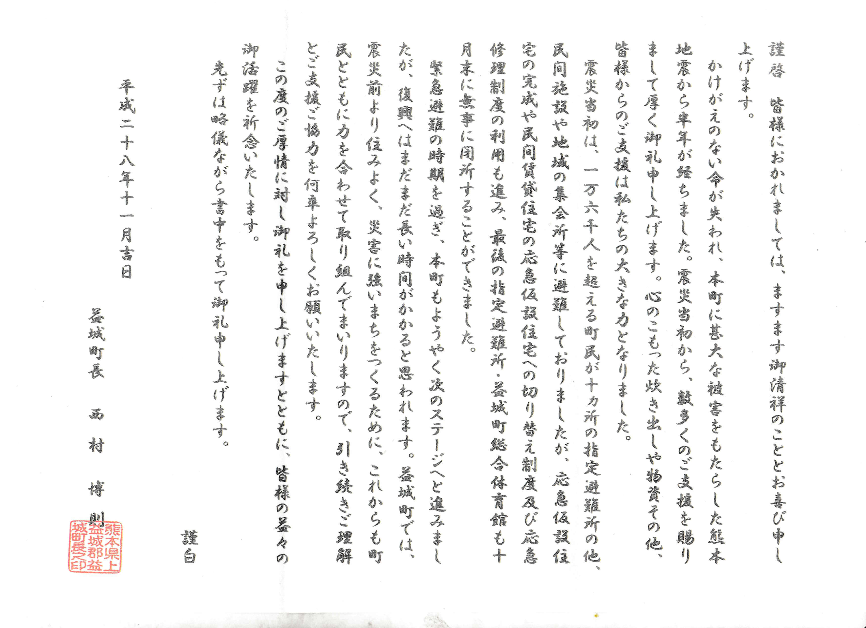 (益城町立広安小学校避難所、広安西小学校避難所)、並びに介護施設ケアポート益城様