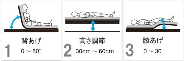 ひざ上げと背あげ、高さ調節の3つの機能がそろっているものが現在の福祉用ベッドとしては最高級になっています。