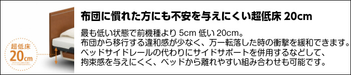 部屋になじむインテリア性の高い高級感あふれるベッドで超低床のため、布団に慣れているから高いベッドでは不安だという介護を受ける方にも精神的負担が少ない側面があるのでベッドに慣れていないことからくる転落のリスクも少なくなります。