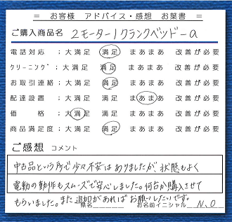 ![]() ・中古品という所で少々不安はありましたが、状態もよく電動の動作もスムーズで安心しました。何台か購入させてもらいました。また追加があればお願いしたいです。(県なし:N.O) |