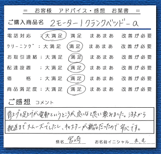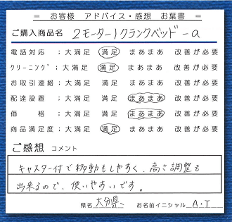 ![]() ・背上げと足上げが電動というところが、良いなと思い頼みました。注文から配送までスムーズでしたし、キャスターが新品だったので安心です。(宮崎県:a.a) |