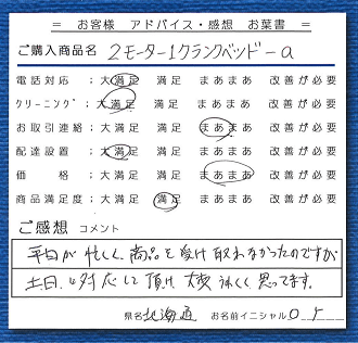 ![]() ・平日が忙しく、商品を受け取れなかったのですが、土日に対応して頂け、大変うれしく思ってます。(北海道:O.Y) |