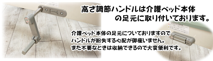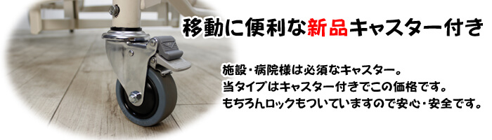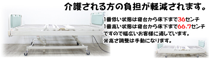 当タイプは2モータ1クランクタイプのシーホネンス製です。介護ベッド、医療ベッドの国内トップクラスのシェアを誇るブランドですので製品も安心してご利用いただけます。また2モーター1クランクとは2つのモーター(電動)と1つのクランク(手動)で操作できる機種となっております。よく使用する頭上げや足上げは電動ですので便利です。また高さ調節はご利用者様に合わせて立ちやすい高さなどに手動設定して頂くと便利です。 ※新品キャスター付き